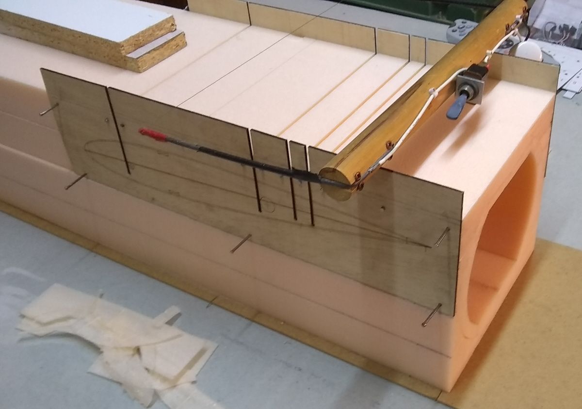 Four accurate slots cut for formers. The root rib shape is etched on the plywood guides.