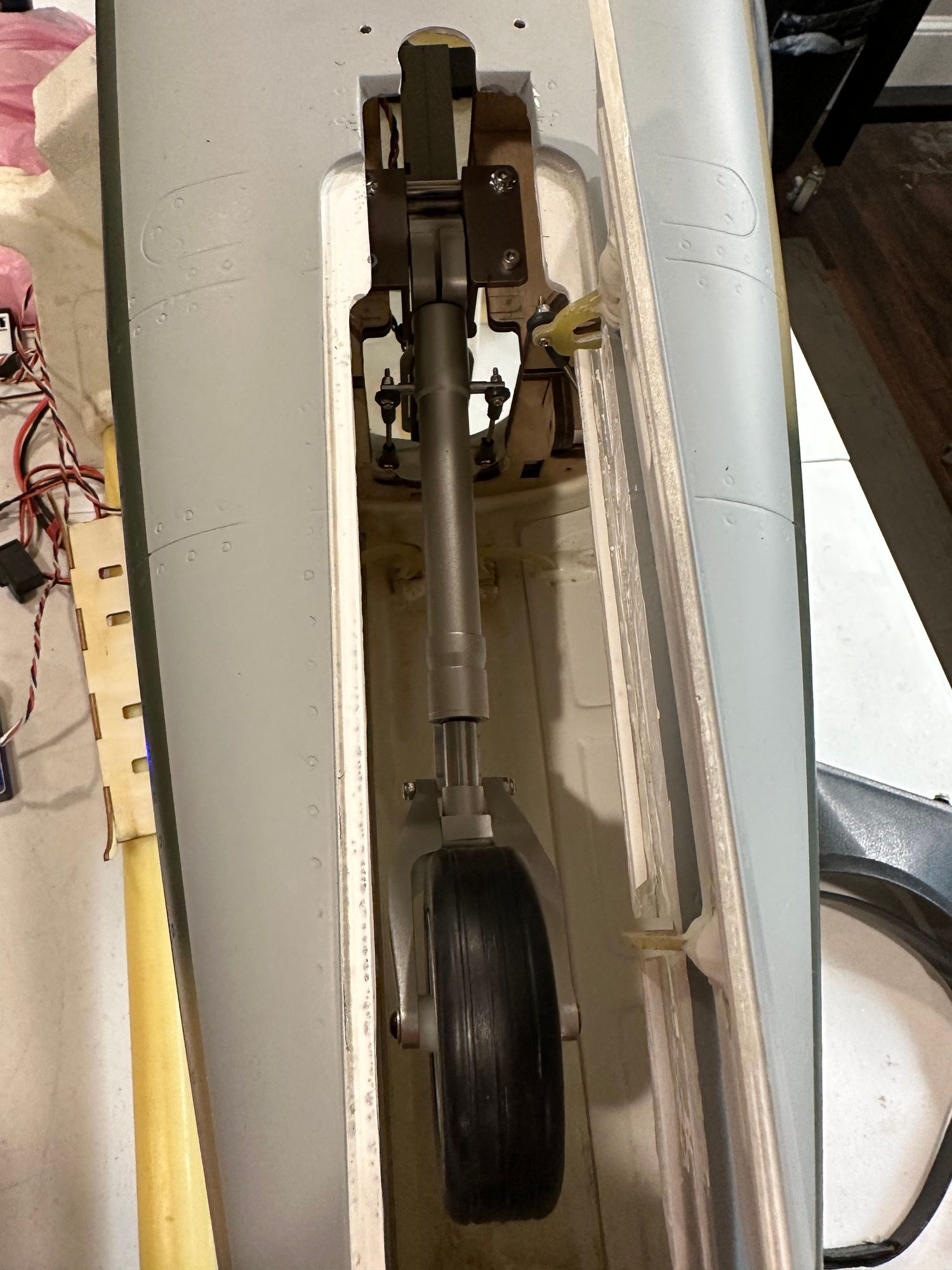 Notice two small holes in fuse near relief to allow use of a ball driver to secure rear of retract.